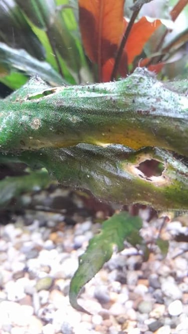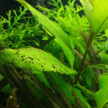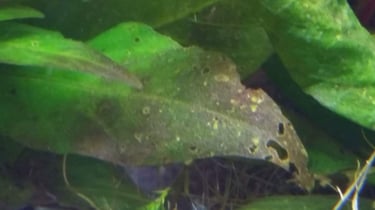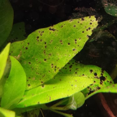 Najčastejší v akváriách s aktívnym substrátom. Spôsobuje hnednutie listov od špičky k báze a bodkovité riasy.