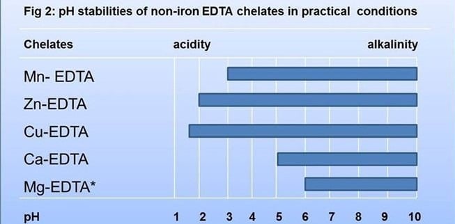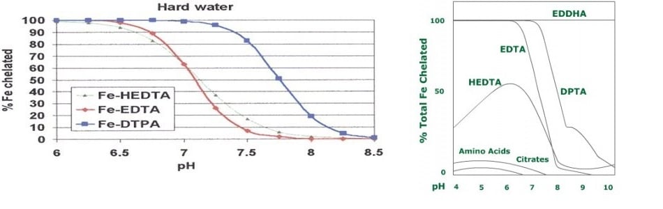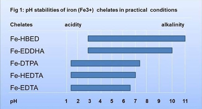 „V bežne dostupných rastlinných hnojivách sa železo nachádza vo forme komplexov (Fe-EDTA, Fe-HEEDTA, Fe-DTPA), ktoré pri vyššom pH (nad 8–8,5) podľa skúseností strácajú svoju účinnosť.”