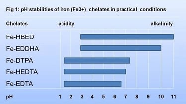 „Keďže každý graf ukazuje iný priebeh krivky, je ťažké presne určiť stabilitu pH pre jednotlivé cheláty železa.”